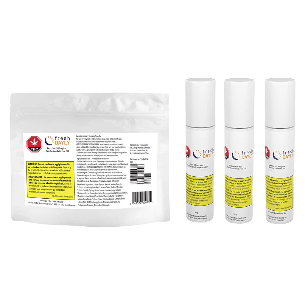 freshDAYLY - Fresh CBD Body Wash: A cruelty-free body wash made with a burst of fresh citrus scent, Fresh CBD Body Wash is formulated with 125 mg CBD and 6.25 mg THC. Deluxe ingredients include Green Tea Extract, Aloe Vera juice and Canola Oil